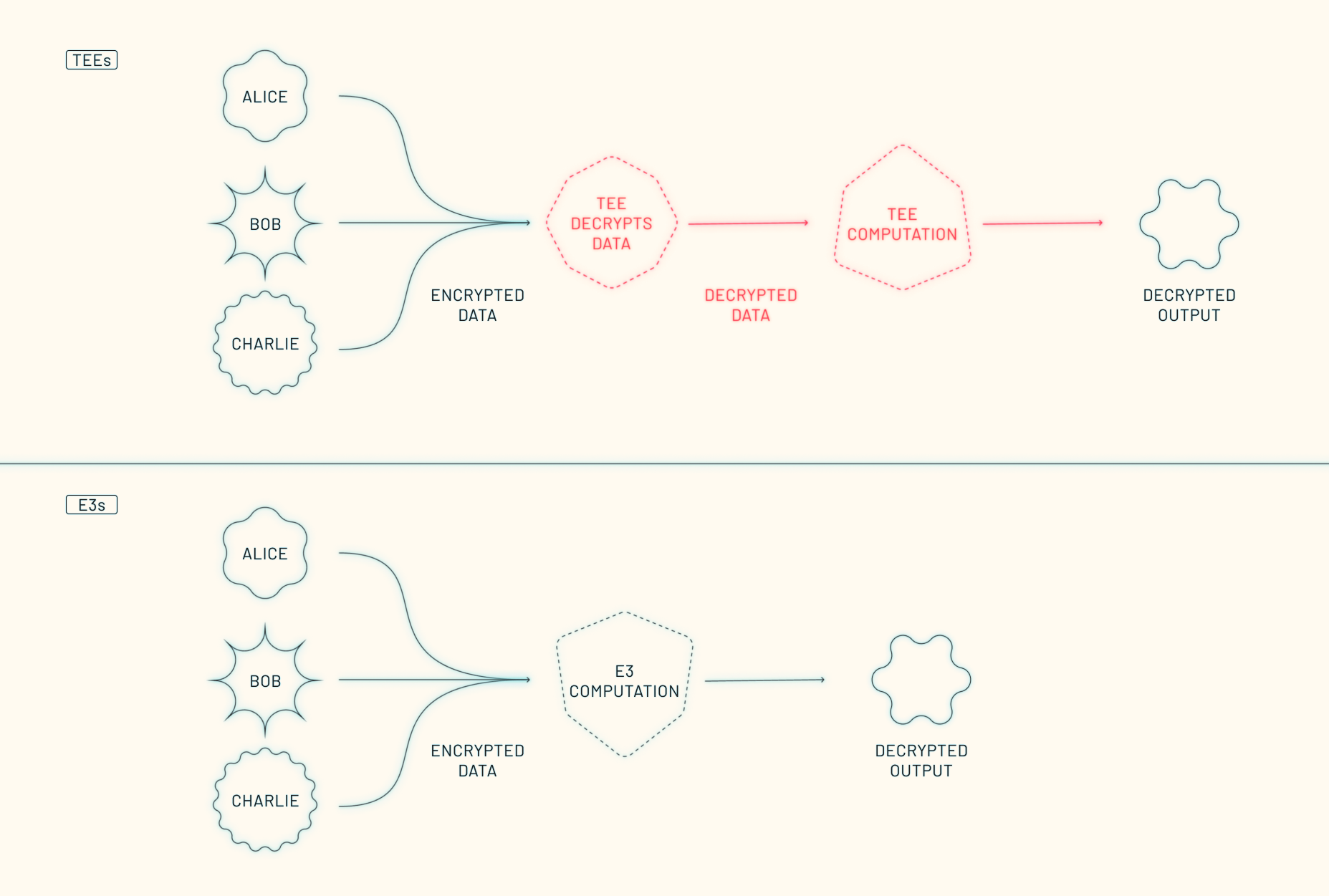 Unlike TEEs, which rely on attestation-based hardware security, we designed E3s to distribute trust through programmable cryptography and decentralized coordination. This architecture keeps data encrypted even during computation, significantly reducing centralized security risks. E3s can also be deployed flexibly across different machines and infrastructures, offering a modular and open-source alternative to TEEs.