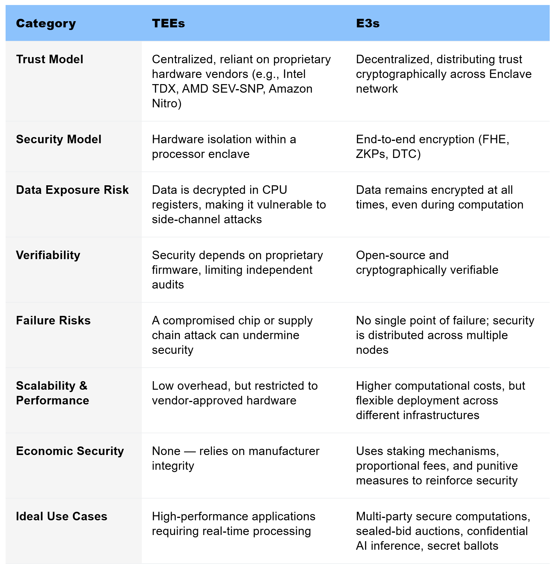 TEEs and E3s reflect a philosophical divergence in how they enforce trust. TEEs establish trust through centralized, hardware attestation, reinforcing traditional structures that assume controlled environments and vendor oversight. E3s, by contrast, rely on decentralized, cryptographic proofs of correctness, aligning with emerging societal preferences for collective governance, transparency, and distributed accountability.