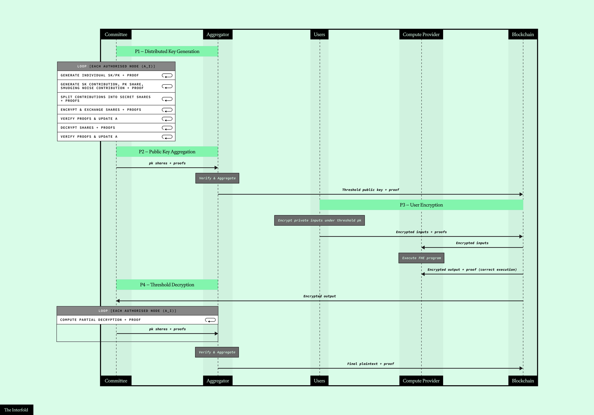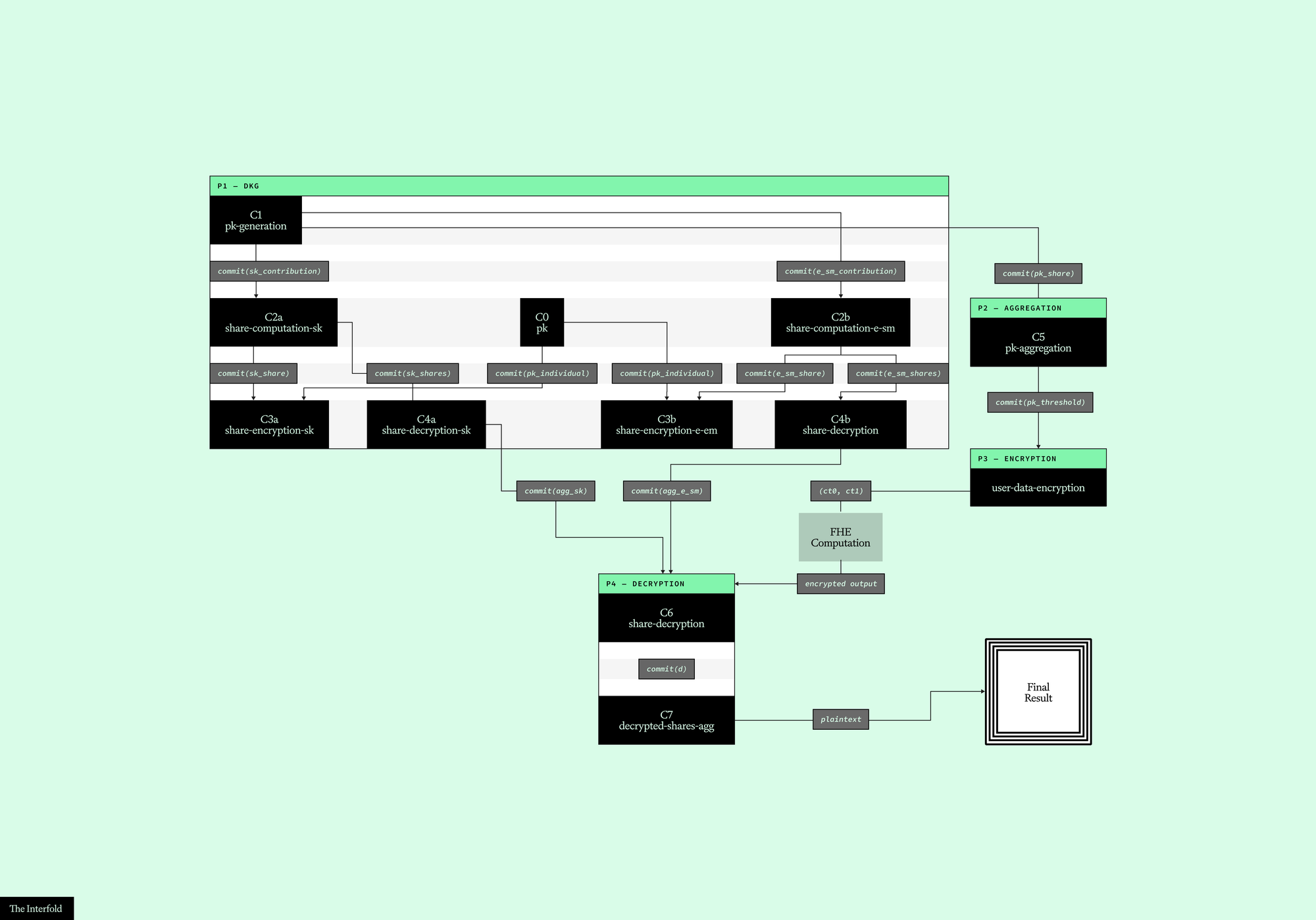 With the Interfold, we designed a cryptographic construction that combines threshold fully homomorphic encryption (FHE) with distributed key generation (DKG), using zero-knowledge proofs (ZKPs) at every stage to ensure that each step — from key generation to final decryption — is publicly verifiable. This construction replaces trust assumptions with verifiable cryptography backed by economic incentives.